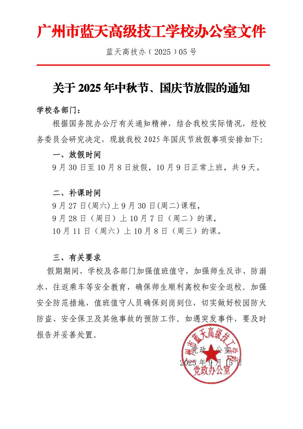 关于2025年中秋节、国庆节放假的通知