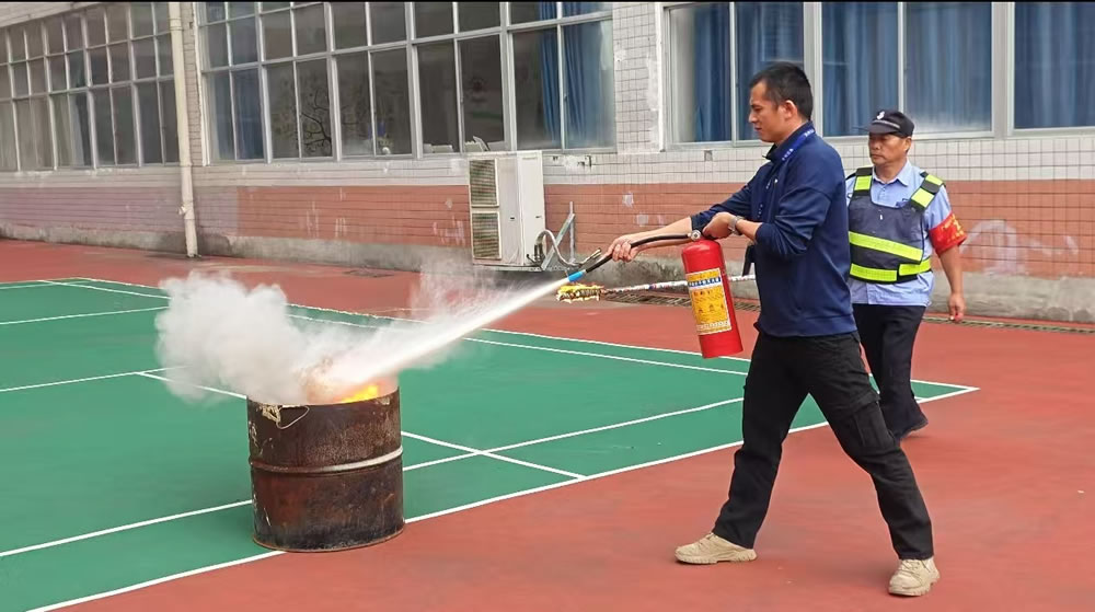 “光说不练假把式”,理论培训结束后,全体参训师生移步至学校操场预设的演练区域,进行灭火器与消火栓的实操演练。