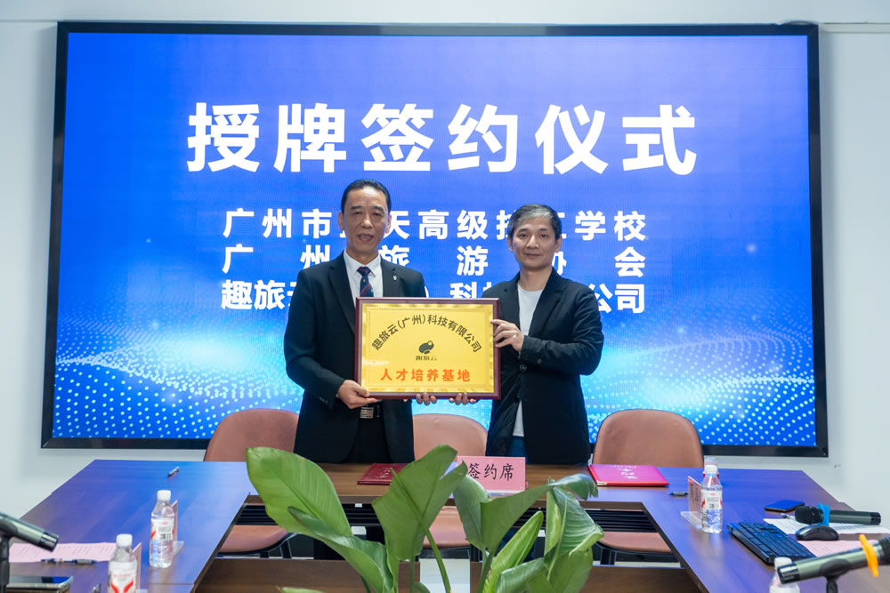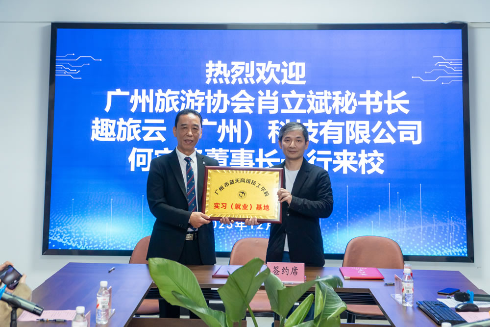 12月25日,广州蓝天高级技工学校与广州旅游协会、趣旅云(广州)科技有限公司的校、企、协三方签约授牌仪式在蓝天高技隆重举行。广州旅游协会秘书长肖立斌、全媒体营销分会副会长杨瑞安、趣旅云科技董事长何宇峰、助理陈仲珊,蓝天高技校长魏跃进、常务副校长丁海洋、就业服务中心主任周泽明、电子商务产业系主任陈伟文,以及相关专业教师和学生代表,共同见证这一重要时刻。这也标志着一场围绕新媒体运营人才培养、助力文旅产业升级的深度合作,就此启航。