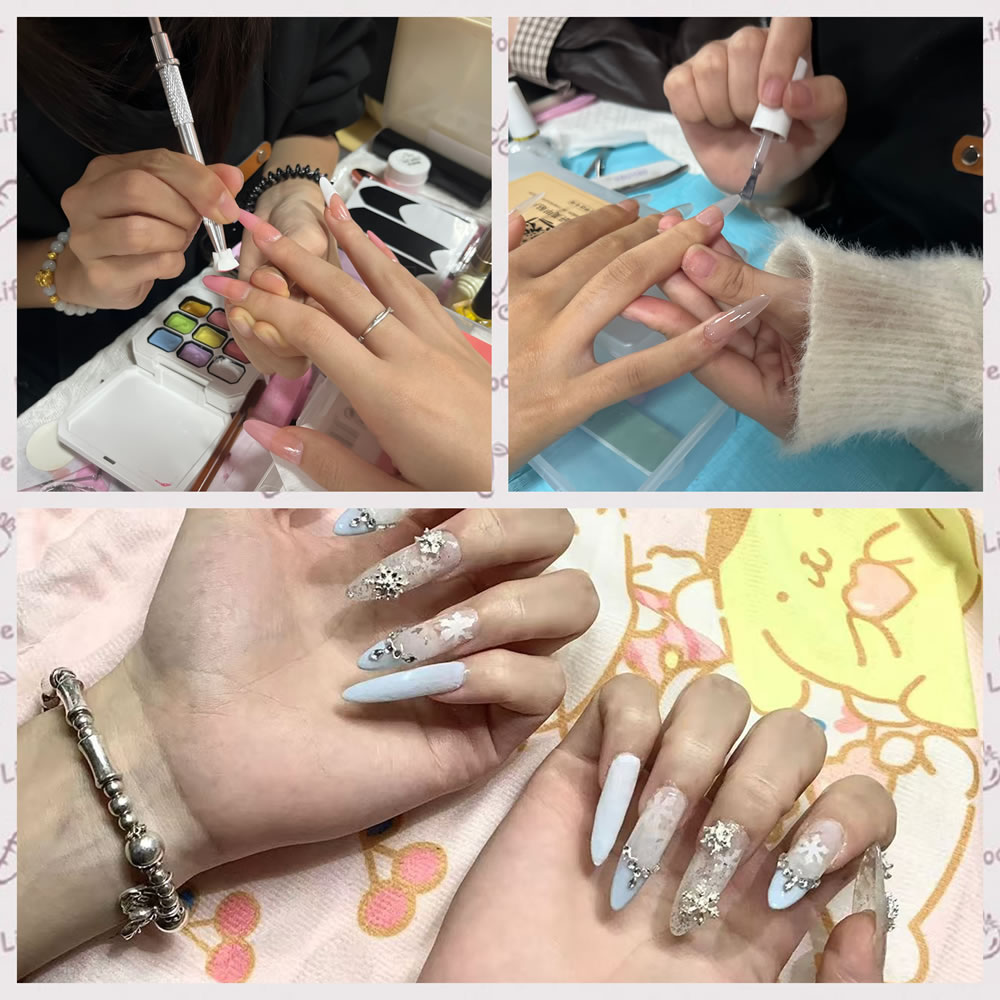 活动当天,60个体验营摊位前都人气爆棚,长长的队伍中满是期待的身影。身着专业工装的“小小美甲师”们分工明确、热情满满,从主动上前介绍款式、耐心倾听需求,到细致讲解美甲护理知识,每一个环节都尽显专业素养。为了呈现最佳效果,他们严格遵循修型、打磨、打底、上色、封层等多道工序,无论是清新简约的纯色款、灵动可爱的卡通款,还是精致大气的钻饰款,都精心雕琢、独具匠心。指尖翻飞间,原本朴素的指甲变得光彩夺目,每一款作品都承载着创意与心意,不仅赢得了参与者的连连称赞,更让大家在沉浸式体验中忘却烦恼、收获快乐。现场笑语不断,师生们拿着焕然一新的指尖作品拍照分享,暖意与幸福感在校园中蔓延。