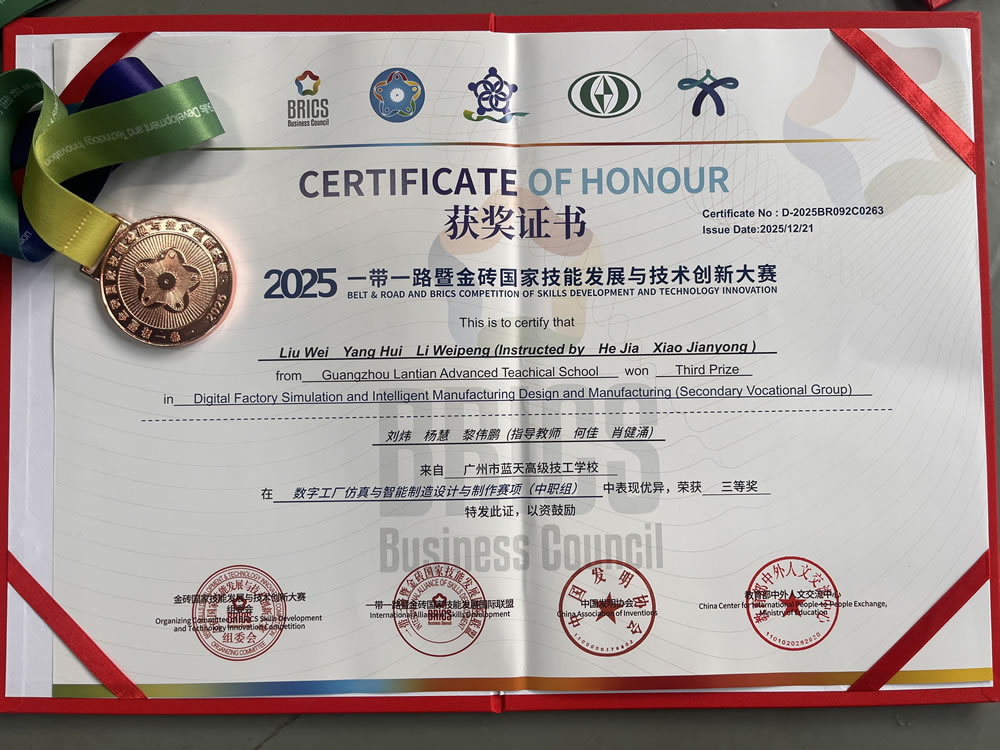 近日,2025“一带一路”暨金砖国家技能发展与技术创新大赛数字工厂与智能制造设计与制作赛项中职组决赛结果揭晓。广州市蓝天高级技工学校学子再度斩获佳绩,成功拿下中职组三等奖。