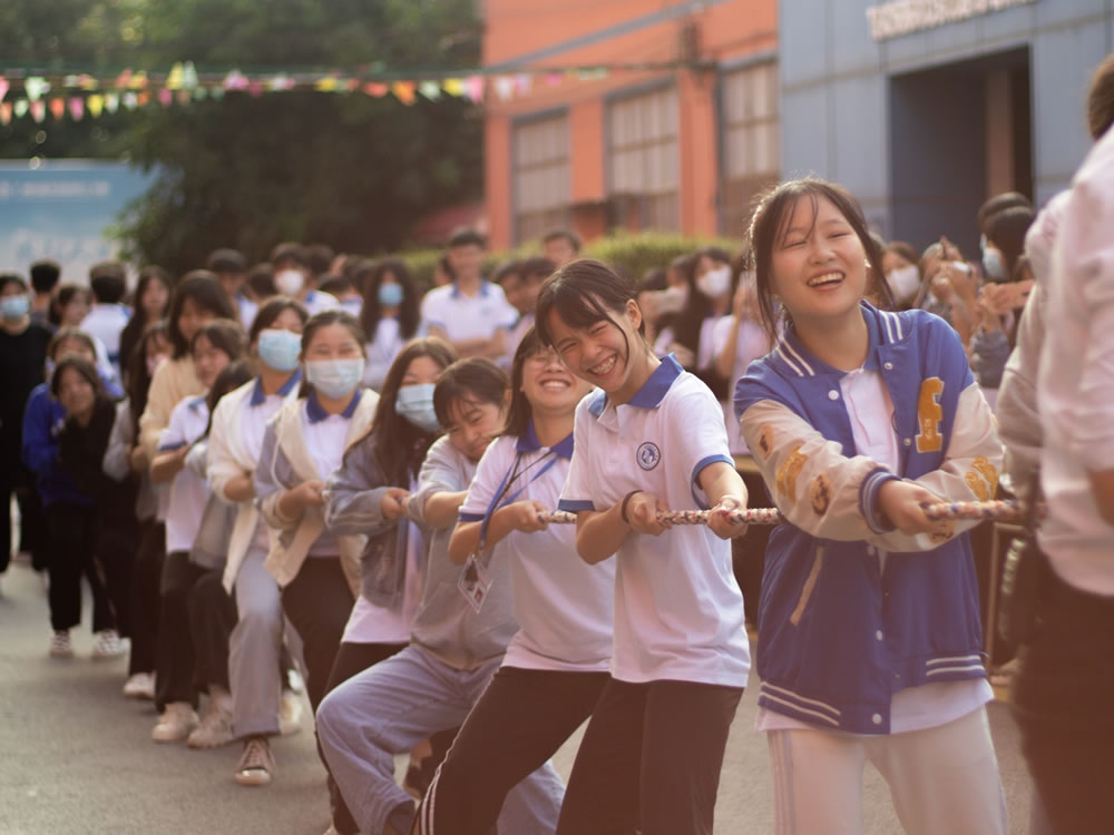 随着裁判举起手中的红旗,在场所有人的神经都绷紧了。只听见一声哨响,双方队伍瞬时间使出全力。围观的同学们不断呐喊着:“加油!加油!”鼓励的声音在校园里回响,试图以这种方式把自己的力量传递给场上正在奋力比赛的运动员们。从哨声吹响开始,两方就你来我往,互不相让,象征着胜利的中线,像一叶孤舟在风暴肆虐的海面上被咆哮着,飘忽不定。但随着其中一方的突然施力,这个摇摇欲坠的平衡被打破,随即而来的是压倒性的胜利,中线被扯过界。与哨声同时响起的还有围观同学的欢呼。