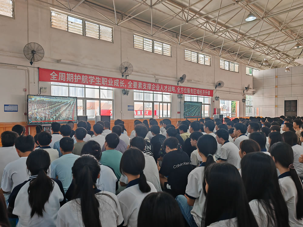 9月3日上午,广州市蓝天高级技工学校组织全体师生汇聚学校礼堂、党员活动中心和各班教室等场所,集中观看“纪念中国人民抗日战争暨世界反法西斯战争胜利80周年大会”,共同见证国家盛典,凝聚爱国情怀与责任担当。