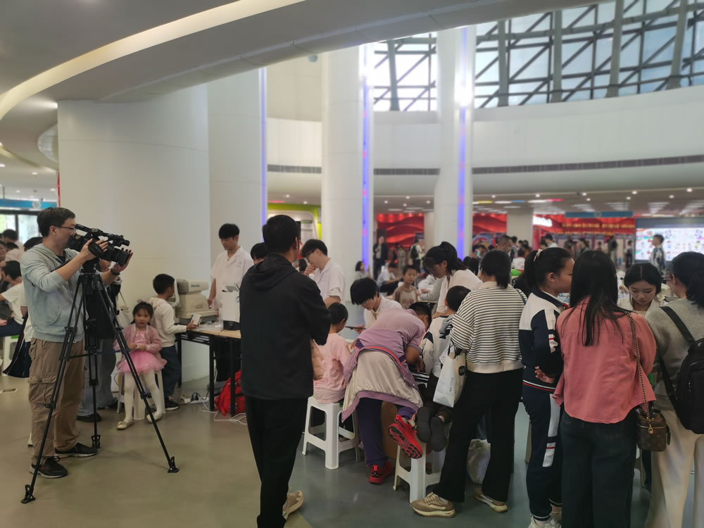 活动现场划分了四大服务区域,每个角落都飘着暖意,藏着专注。在验光服务区,蓝天高技的师生们早把设备调试妥当——裸眼视力检测、电脑验光、散光筛查,一项项检查有条不紊。“小朋友,盯着镜头里的小房子,慢慢睁大眼哦。”眼视光专业的学生志愿者弯着腰引导,笔尖在记录表上认真记下每一组数据,之后再由教师团队进行综合评估,给家长们唠唠 “怎么控制孩子看屏幕时间”“哪些食物对眼睛好” 这类实用护眼建议。陪孩子来的王女士笑着感慨:“平时工作忙,很少系统关注孩子的视力,今天不仅免费验了光,还学到了很多实用知识,来得太值了!”